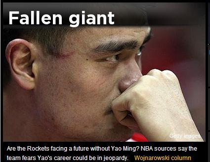 中新網(wǎng)6月30日電 北京時間今日凌晨,雅虎體育以“巨人的墜落”為題報道稱:姚明腳踝傷勢已非常嚴(yán)重,可能缺席下賽季大部分常規(guī)賽。隨后美國媒體紛紛對此事發(fā)表評論。