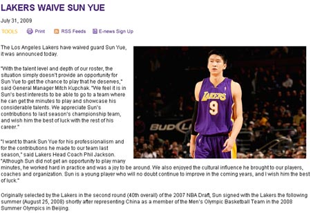 中新網(wǎng)8月1日電 當(dāng)?shù)貢r(shí)間7月31日,NBA上賽季冠軍湖人隊(duì)通過官方網(wǎng)站,宣布放棄來自中國的后衛(wèi)孫悅。