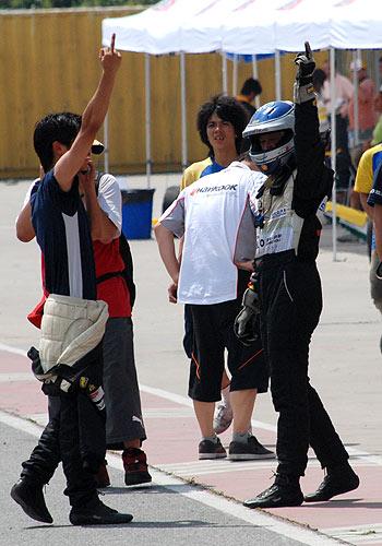 在事故發(fā)生后,韓寒鉆出已經(jīng)面目全非的賽車,用盡全力狠狠地摔了下車門,然后走下賽道。掙扎著駛回賽道的王睿,也在幾圈后遭遇裁判黑旗而退出比賽。當(dāng)王睿將車開(kāi)會(huì)維修區(qū)時(shí),已經(jīng)脫下一半賽服的韓寒,一邊打電話,一邊上前安慰王睿。隨后,兩人非常默契地同時(shí)伸出中指,高高地指向天,并各自轉(zhuǎn)了360度,以便讓現(xiàn)場(chǎng)的更多觀眾和記者看到。此舉立刻引起軒然大波。