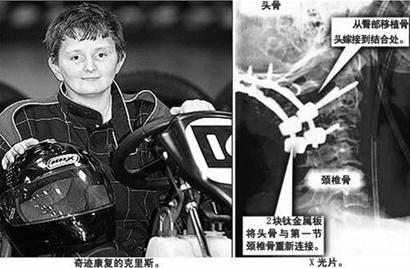 克里斯的母親戴比激動地說:“他終于重返心愛的運動,想到他曾經(jīng)被‘斬首’,這真是一個奇跡!卑尼t(yī)生表示:“克里斯實在是個‘奇跡小子’。他是世界上唯一一名經(jīng)歷了如此嚴重的外傷后又重新過上正常生活的人。其他的類似患者雖然也有極個別幸存,可是全都徹底癱瘓! (朗朗)