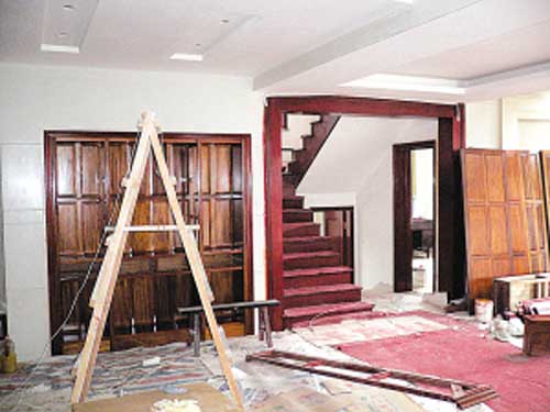 在丁俊暉的伯父丁龍君的帶領(lǐng)下,記者參觀了“江南春天”的內(nèi)部裝修。盡管屋子里仍堆放著一些尚未完成的家具,但整體裝修已經(jīng)初步完成。走進(jìn)客廳,一張紅木的大圓桌映入眼簾!斑@桌子全紅木的,光雕工就要3千多塊,”丁龍君一邊說一邊指著放在邊上尚未拼裝起來的三個大床,“這幾張床也是紅木的,我們請的宜興的師傅,雕工相當(dāng)棒的,這件房子里,只要是木頭就都是紅木的,除了桌子椅子、床和衣櫥,二樓和三樓的博古架,我們連廚房的櫥柜也都用的紅木,包括家里的樓梯、房門和門套!倍↓埦嬖V記者,丁俊暉的父親很喜歡紅木的家具,所以在裝修之前花了40多萬買了紅木的木料,家里的家居都是專門請師傅根據(jù)丁俊暉爸爸的要求打的,連工錢一起花了將近60萬。