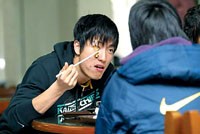 劉翔迅速返回公寓,套上帽衫,陽光很燦爛,劉翔很愜意,他“大搖大擺”、仰著頭,輕哼著流行歌走向食堂!皝砹税。 币蛔哌M二樓田徑隊的飯?zhí),立即有廚師倍兒親切地招呼他,劉翔笑著說“餓了”。跨欄組幾個人坐到東北角,這是他們的“老地方”。接著劉翔和大伙兒一起排隊,盛上青菜、棒骨、肉末燉粉條、炒雞蛋和白米飯,又拿了個柚子。