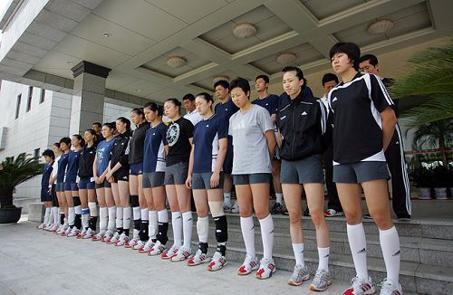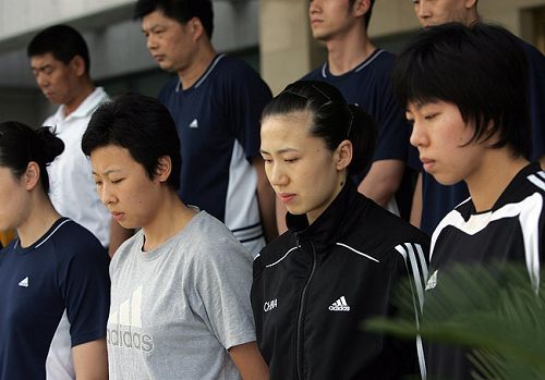 下午14時許,全隊一反平日午休的習(xí)慣,匯集在基地體育賓館大堂,姑娘們都刻意回避穿著那套紅色的運動服。14時25分,全體教練員、運動員在國家排球運動管理中心徐利主任的帶領(lǐng)下,在賓館外整齊列隊,徐利主任說:“根據(jù)國務(wù)院公告,為表達(dá)全國各族人民對四川汶川大地震遇難同胞的深切哀悼,中國女排隊為遇難者默哀!14時28分寧波北侖空襲警報聲劃破長空,體育賓館外的馬路上,汽車笛聲四起,女排姑娘們神色凝重,低頭為7天前的這個時刻遭受地震劫難的人們默哀。