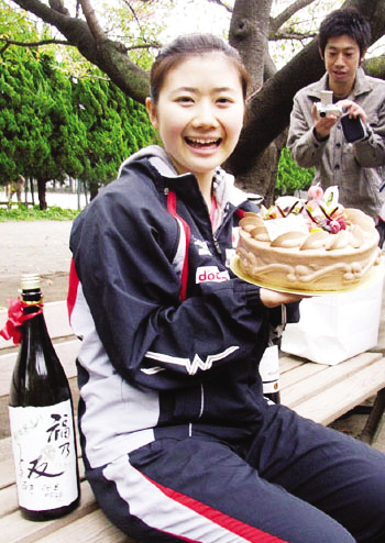 面對(duì)眾人送上的蛋糕,福原愛(ài)高興地接受了,但對(duì)來(lái)賓們“整蠱”似地送上的日本清酒,單純可愛(ài)的福原愛(ài)并不為所動(dòng),“雖然我出生在釀酒世家,但從小就對(duì)含有酒精的清酒味道相當(dāng)?shù)钟|。盡管作為一名成年人可以喝酒了,但我卻依然會(huì)堅(jiān)持滴酒不沾的原則,包括抽煙也一樣,絕對(duì)不會(huì)去碰!备T瓙(ài)的祖輩都是釀酒的行家里手,據(jù)說(shuō)她的父親福原武彥更是酒量驚人。