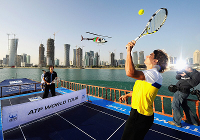 2009年,ATP(國(guó)際職業(yè)網(wǎng)球聯(lián)合會(huì))推出了全新的世界巡回賽,為宣傳這一嶄新的賽事,ATP官方昨天請(qǐng)到了當(dāng)今世界男子網(wǎng)壇兩大天王納達(dá)爾和費(fèi)德勒,讓他們?cè)诙喙凰覀鹘y(tǒng)的阿拉伯帆船上進(jìn)行了一場(chǎng)網(wǎng)球賽。波斯灣上的帆船上,世界上最優(yōu)秀的兩位球員踏上特制的賽場(chǎng),為ATP世界巡回賽的起航而揮拍。