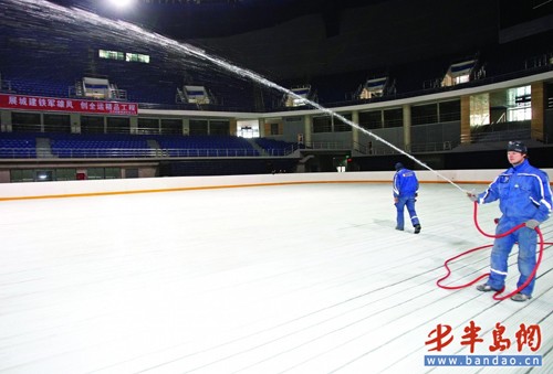 預(yù)計(jì)兩天時(shí)間,專家就可為1800平方米的賽場(chǎng)鋪上一層大約4厘米厚的冰面,為4月份將要在青島舉行的十一運(yùn)花樣滑冰和短道速滑的比賽做好準(zhǔn)備。