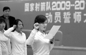 昨天下午,新一屆中國(guó)射箭隊(duì)在廣州黃村基地進(jìn)行了動(dòng)員大會(huì)。在射運(yùn)中心主任高志丹,副主任王義夫和總教練田渝陵的帶領(lǐng)下,北京奧運(yùn)射箭金牌得主張娟娟代表運(yùn)動(dòng)員宣讀誓詞,射箭隊(duì)全隊(duì)面對(duì)國(guó)旗誓師。