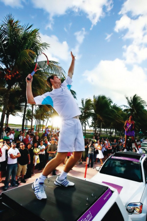 邁阿密當?shù)貢r間3月23日,為了宣傳索愛公開賽,大威和穆雷分別站到一輛車上,打起了“車上網(wǎng)球”。