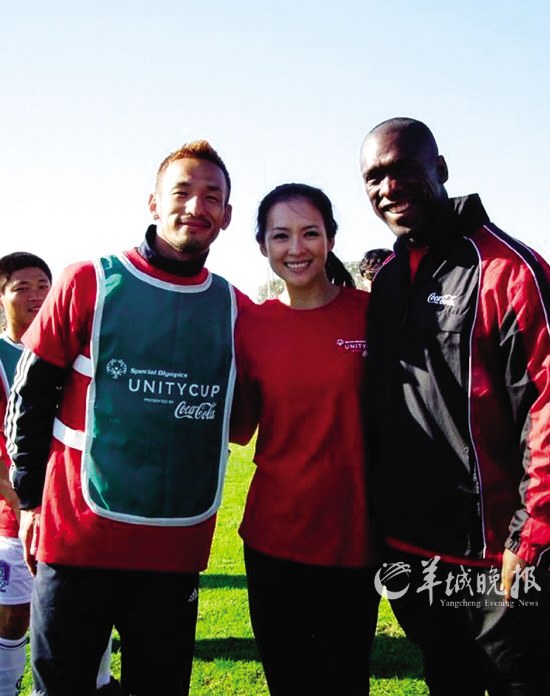 據(jù)悉,章子怡于2006年起擔(dān)任特奧會全球形象大使,至今已有4個年頭。這一次,特奧會舉辦的“團結(jié)杯”比賽旨在讓全社會接納和包容智障人士。章子怡說:“這次在世界杯期間受邀來到南非,主要是希望通過足球這項大家都熱愛的運動,讓更多人了解智障這個群體!绷硗,和特奧運動員一起參加比賽練習(xí)的還有“亞洲足球先生”中田英壽、NBA球星迪坎貝·穆托姆博、AC米蘭隊員克拉倫斯·西多夫等。在練習(xí)過程中,章子怡還跟中田英壽學(xué)習(xí)背后傳接球的動作,沒想到還一次成功,贏得了現(xiàn)場很多人的掌聲。
