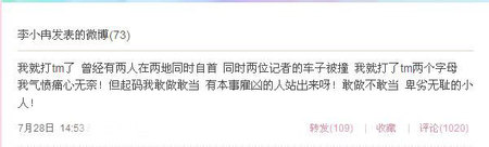 最近福建兩位記者因揭露“紫金礦業(yè)”,結(jié)果在同一天兩位記者的車子同時被撞。李小冉尤其關(guān)注這則新聞,她在昨日中午的微博中發(fā)飆:“天災(zāi)就夠叫人無奈的了,人禍也是沒完沒了!彼 在微博中爆粗口,引來粉絲圍觀,認為其有損形象。