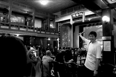 晚上7點,記者購票進入演出大廳,此時一層上座率達到四成,二層觀眾寥寥無幾。一些觀眾掏出相機、手機在臺前合影留念。一個小伙子擺出搖扇子的造型,一邊指揮女友往后站拍全景,一邊自言自語:“不知道哪天再開業(yè),先留個影兒吧!