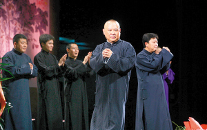 郭德綱、于謙合作10周年專場演出14日如約開場,現(xiàn)場座無虛席。此番亮相的郭德綱顯得頗為低調,他在對話中表示,自己只是一個說相聲的,“能力有限,水平一般”。此次演出郭德綱個人為舟曲災區(qū)捐出了10萬元,德云社和演出承辦方也各捐出5萬元,對于因為哀悼日而暫停的15日的演出,郭德綱表示:“所有15日票的觀眾都可以去退票,也可以留著,等我們開演的時候繼續(xù)使用,F(xiàn)在不是我們不訂演出時間,實在是北展后面的演出太多了,一切需要重新協(xié)調。”