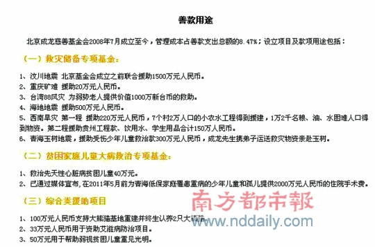 北京成龍慈善基金會成立于四川地震后2008年7月,旨在幫助捐款人成龍及其他所有捐款好友并監(jiān)管各類善款。這次捐款風(fēng)波的發(fā)生,北京成龍慈善基金會成為關(guān)注焦點(diǎn),善款去向也成為許多人期望了解的內(nèi)容。昨天,該基金會官網(wǎng)上“善款用途”欄目中,一筆歸為救災(zāi)儲備專項基金的“汶川地震北京基金會成立之前聯(lián)合援助1500萬元人民幣”引起人們關(guān)注,有媒體對比先前公開資料,發(fā)現(xiàn)2008年5月13日成龍與楊受成曾以成龍、楊受成基金的名義聯(lián)合捐助了1000萬,而另外的500萬捐助卻無跡可尋,在官網(wǎng)上也并無清晰的說明。因此有關(guān)500萬的下落追蹤又引出了新的爭議,對此黨群向南都記者解釋道,這筆500萬元屬于聯(lián)合捐助款項,“這些錢都是在基金會成立之前(捐獻(xiàn))的,所以沒有走基金會(這邊的程序)。之前媒體報道的是那一大筆錢(指成龍、楊受成聯(lián)合捐助的1000萬),那一小筆(指500萬)沒有報道過,這筆錢采用的方式用途等統(tǒng)統(tǒng)也沒有對外透露,當(dāng)時是計劃等(項目)全部確實做成了才宣布!