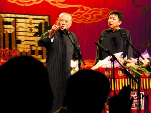 當郭德綱和于謙上場時,觀眾更是送上大型玩具熊,讓郭德綱樂開了花。由于昨晚來到現(xiàn)場的大部分是“資深鋼絲”,因此演員們的唱段觀眾幾乎都能跟著唱,郭德綱見此情景恍惚間兩眼含淚。而他的表演也在“回應(yīng)”現(xiàn)實。
