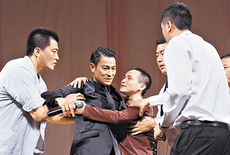 中新網(wǎng)9月21日電 電影《通天神探狄仁杰》前晚在北京大學舉辦首映,劉德華(華仔)、劉嘉玲、李冰冰、梁家輝都到場,活動進行到一半,有位男粉絲竟沖上臺熊抱華仔,被保安強行拉下臺,華仔見狀連忙斥喝保安,要他們動作不要太粗暴,展現(xiàn)巨星風范。