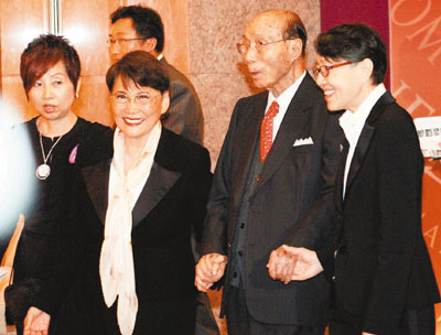 中新網(wǎng)9月29日電 據(jù)香港“文匯報(bào)”消息,“2010年度邵逸夫獎(jiǎng)?lì)C獎(jiǎng)禮”昨晚在香港舉行,頒獎(jiǎng)禮開(kāi)始前,六叔邵逸夫在女秘書攙扶下與特首曾蔭權(quán)及五位得獎(jiǎng)?wù)叩讲季鞍迩懊,讓媒體拍照,當(dāng)六叔準(zhǔn)備入場(chǎng)時(shí),突然現(xiàn)身的六嬸方逸華則在旁邊拖著他進(jìn)場(chǎng),期間有媒體大聲問(wèn)到有關(guān)無(wú)線轉(zhuǎn)售股份一事,不過(guò)六叔未有回應(yīng)