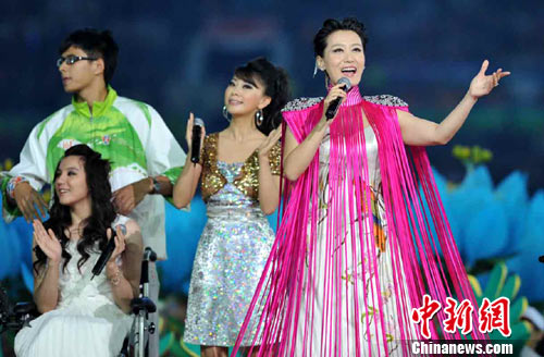 中新網(wǎng)12月13日電 與在海心沙舉辦的亞運(yùn)會(huì)開(kāi)幕式上強(qiáng)烈的視覺(jué)沖力和明星云集不同,12日晚在廣東奧林匹克體育中心上演的亞殘運(yùn)會(huì)開(kāi)幕式則充滿了溫暖和關(guān)愛(ài)。文藝表演環(huán)節(jié)中,除了400多位殘疾人媽媽團(tuán)和300多個(gè)殘疾演員用手語(yǔ)帶領(lǐng)6萬(wàn)名觀眾進(jìn)行愛(ài)的表達(dá)震撼全場(chǎng)之外,一位特殊的明星創(chuàng)紀(jì)錄的三次出場(chǎng)給觀眾帶來(lái)了不同的驚喜和感動(dòng),她就是著名歌唱家、廣州亞運(yùn)會(huì)宣傳大使——譚晶。