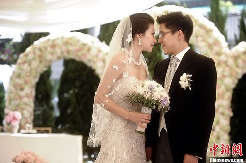 一對新人于正午12時舉行儀式,當(dāng)結(jié)婚進(jìn)行曲響起時,花童們首先進(jìn)場,接著是16位兄弟姐妹逐一步入會場,戴著白色頭紗的郭晶晶則面帶含蓄笑容,在父親的帶領(lǐng)下進(jìn)場,現(xiàn)場賓客均以掌聲歡迎。