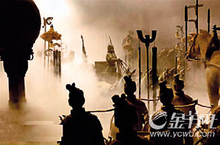 片花放畢,記者們馬上“找茬”。銀幕上一閃而過(guò)地出現(xiàn)了地動(dòng)儀,秦陵里的兵馬俑與戰(zhàn)車(chē)混雜在一起,兵俑手頭都有兵器。但地動(dòng)儀由東漢張衡發(fā)明,秦陵里的兵馬俑和戰(zhàn)車(chē)是完全分開(kāi)羅列的,兵俑都空手無(wú)兵器。