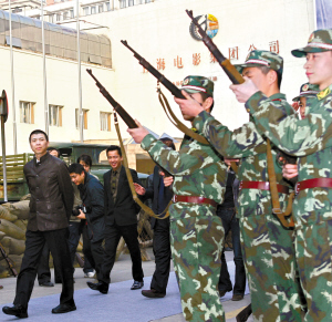 繼在北京舉行了盛大的首映禮之后,《集結(jié)號(hào)》主創(chuàng)一行十多人又馬不停蹄地來(lái)到上海展開(kāi)宣傳活動(dòng)。19日下午,新聞發(fā)布會(huì)選擇在上海電影集團(tuán)5號(hào)攝影棚進(jìn)行。在馮小剛帶領(lǐng)“谷子地”張涵予、廖凡、王寶強(qiáng)、任泉、袁文康、李乃文等主創(chuàng)入場(chǎng)時(shí),武警戰(zhàn)士還鳴槍歡迎。整個(gè)發(fā)布會(huì)現(xiàn)場(chǎng)也布置成了片中硝煙彌漫的“戰(zhàn)場(chǎng)”,有沙袋、機(jī)槍、戰(zhàn)壕等。發(fā)布會(huì)后男主創(chuàng)們還乘敞篷吉普車和軍用卡車前往首映的電影院。