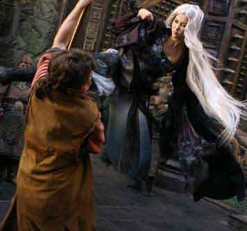 李冰冰飾演冷血白發(fā)魔女霓裳,拍攝時,要耍出“鳳舞九天”一招,最后整個身體掉在假巖而刮傷手臂和手掌,還曾半空中吊威壓飛行而傷到背部。雖然付出良多,但獲成龍大哥贊美為白發(fā)魔女的絕佳人選,李冰冰還是興奮不已。
