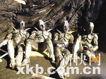 盡管這組劇照中沒能曝光重要角色“短笛大魔王”的造型,但是在擔(dān)任劇組特別化妝效果師的好萊塢資深化妝師Edward French 的個人主頁上,卻有一張魔王的“去頭照”;诒C芾碛桑@張照片在魔王的頭部打上TOPSECRET(最高機(jī)密)的標(biāo)簽。余下的身體部分,乍一看以為是蝙蝠俠造型,但從手臂的肌理來看,確實(shí)與《龍珠》原著的短笛的種族特征相去不遠(yuǎn),除了膚色黝黑與原著的綠色有出入之外,恐怕這就是千真萬確的大魔王本尊了。Edward French 還談到,如此耗時的化妝,長達(dá)一個半月以來他重復(fù)進(jìn)行著,所幸詹姆斯·馬斯特斯這位專業(yè)的演員十分和善也很配合。