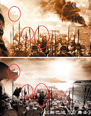 一張《赤壁》和《300勇士》的對(duì)比照昨日成為網(wǎng)友熱議的焦點(diǎn)。照片發(fā)布者圈出吳宇森新片《赤壁》官方海報(bào)中和《斯巴達(dá)300勇士》劇照的相似之處,并直指《赤壁》抄襲。對(duì)此中影營(yíng)銷分公司負(fù)責(zé)人直斥“無(wú)聊炒作”,并稱“每款海報(bào)都有不同的風(fēng)格。”