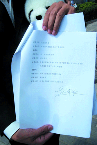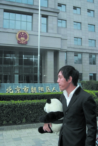 “我就不明白了,熊貓?jiān)趺磿?huì)是綠色眼睛?夢工廠必須給我作出解釋!……”趙半狄頭頂熊貓,手拿起訴書,以及法院的受理號,理直氣壯地站在朝陽區(qū)人民法院的門口,和他的委托代理人站在一起,“咔嚓”了好幾張照片,都貼進(jìn)了他的博客。