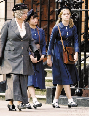 那個(gè)曾經(jīng)滿臉稚氣的赫敏在《芭蕾舞鞋》中已經(jīng)長成了大姑娘,個(gè)頭比很多同齡人都高,長及肩膀的波浪長發(fā)讓她顯得更為成熟。改變最大的是發(fā)色,愛瑪在《哈利·波特》中頭發(fā)還是栗子色的,但在《芭蕾舞鞋》中變成了金黃色。原來,后者才是她的本來發(fā)色。當(dāng)初拍《哈利·波特》時(shí),因?yàn)榱_琳原著中赫敏的頭發(fā)是栗子色,愛瑪只能忍痛讓發(fā)型師把她的頭發(fā)全部染了。新片中,愛瑪?shù)膽蚍⒉唤k爛,嚴(yán)謹(jǐn)?shù)挠⒏裉m女學(xué)生制服雖然沒有女巫披風(fēng)那么“拉風(fēng)”,但卻同樣襯得她秀美而純情。