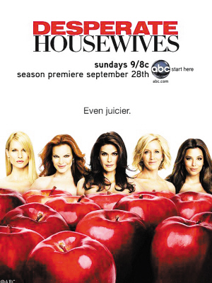 《絕望的主婦》第五季宣傳海報日前曝光。海報延續(xù)了前季的“主婦與蘋果”的創(chuàng)意,不過這次五位主婦裸露香肩,隱身于一堆蘋果后面,極盡誘惑!督^望的主婦》第五季將于9月28日回歸。