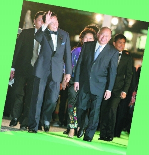 前日,導(dǎo)演吳宇森率領(lǐng)梁朝偉、金城武、張震、林志玲、趙薇、張豐毅等群星,浩浩蕩蕩出席第21屆東京國(guó)際電影節(jié)揭幕禮。大會(huì)將星光大道的紅地毯改為綠地毯,又以最新的環(huán)保汽車接載嘉賓,以配合大會(huì)的環(huán)保主題。9月底才剛上任的日本首相麻生太郎,專程與導(dǎo)演吳宇森一起走上星光大道的綠地毯,一路上似乎言談甚歡。麻生太郎是首位出席東京電影節(jié)的日本首相,還非常捧場(chǎng)地觀看了電影《赤壁》。除吳宇森外,一眾《赤壁》演員中只有梁朝偉與金城武有幸與麻生首相合照。