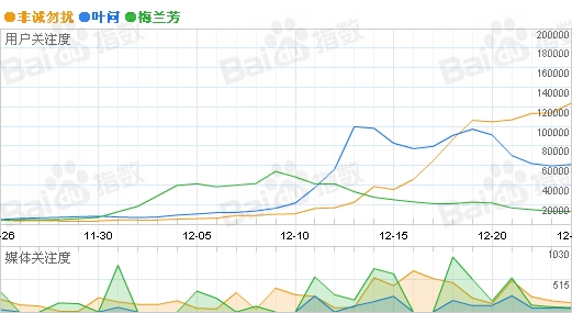 數(shù)據(jù)顯示,“非誠(chéng)勿擾”自公布以來,搜索量持續(xù)上升,尤其是其12月18號(hào)公映之后,日搜索次數(shù)很快超過10萬,到目前已經(jīng)逼近15萬,遠(yuǎn)遠(yuǎn)超過了《葉問》、《梅蘭芳》、《赤壁(下)》和《女人不壞》。而從全球最大的中文社區(qū)百度貼吧中網(wǎng)友對(duì)該片的評(píng)價(jià)來看,76%以上的投票者打分90分以上,百度博客搜索中“非誠(chéng)勿擾”的檢索結(jié)果也達(dá)到了2.7萬多,網(wǎng)友的討論和口碑均持續(xù)火爆。為此,百度的數(shù)據(jù)預(yù)測(cè),《非誠(chéng)勿擾》將成為歲末票房最大的贏家。