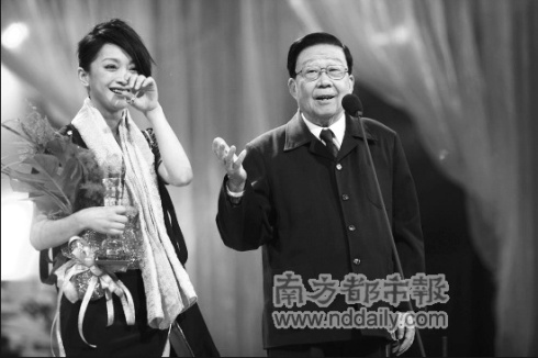 2008年度影視頒獎盛典7日晚揭曉,周迅的恩師謝鐵驪導(dǎo)演親自為她頒獎,讓周迅不禁激動落淚:“沒有謝導(dǎo)就沒有今天的我!(見上圖)當(dāng)宣布邀請謝鐵驪導(dǎo)演登臺頒獎時,原本在臺上的周迅立即沖下去,走到觀眾席親自攙扶謝導(dǎo)走上舞臺。18年前周迅在銀幕處女作《古墓荒齋》,正是出自謝鐵驪導(dǎo)演之手。此番再次會面,讓兩人都是感慨不已。
