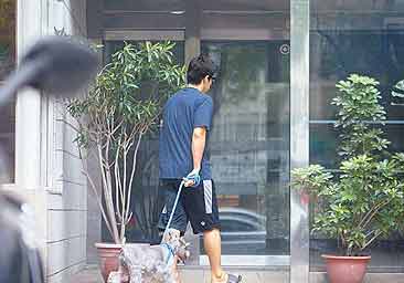 蔣友柏穿著短褲拖鞋遛狗,打扮隨興。