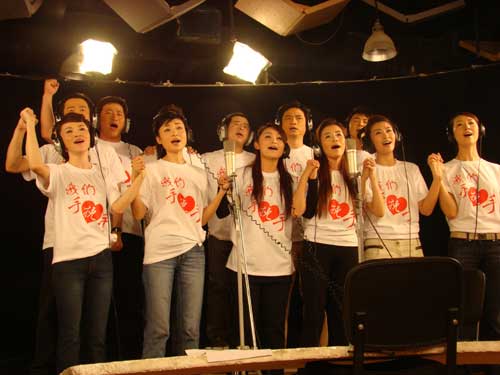 在將近10個小時的錄制過程中,所有參與的工作人員在將近五十度高溫的錄音棚內(nèi)堅(jiān)持工作,以最飽滿的熱情錄制歌曲。朱軍、董卿還都是在結(jié)束了白天的工作后在凌晨直接趕到錄音棚的,整個錄制過程到凌晨1點(diǎn)半才結(jié)束。大家都真心地希望通過這首歌曲能給災(zāi)區(qū)人民帶去些許撫慰,能夠鼓勵大家攜起手來堅(jiān)強(qiáng)面對,共渡難關(guān)。