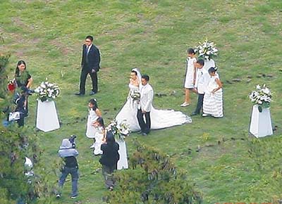 排場(chǎng):嘉玲和偉仔是首對(duì)香港藝人在不丹結(jié)婚,并獲國(guó)王協(xié)助,于王宮的寢室拍結(jié)婚照