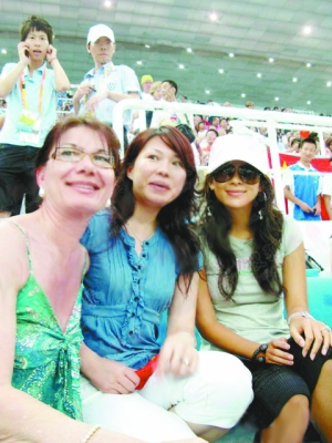 章子怡(右一)在水立方看了跳水,并為郭晶晶加油。