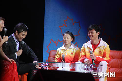 北京奧運(yùn)冠軍仲滿、何雯娜在演出現(xiàn)場(chǎng)與觀眾互動(dòng)。