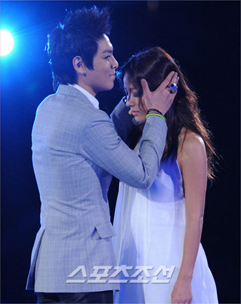 據(jù)體育朝鮮報(bào)道,15日晚7時(shí),在首爾蠶室室內(nèi)體育館舉行的“2008 Mnet-KM音樂(lè)節(jié)”( 以下簡(jiǎn)稱“MKMF”)上,李孝利和T.O.P在共同演繹《謊言》時(shí),表演了兩個(gè)嘴唇互碰的熱吻場(chǎng)面。