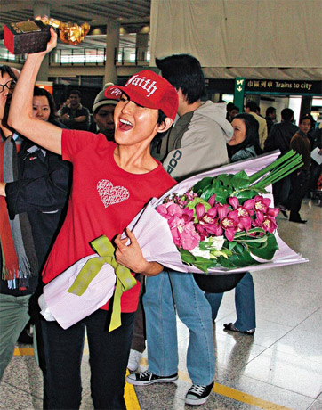 劉美君昨日返港時(shí),獲歌迷獻(xiàn)花,她興奮得拿著金馬獎(jiǎng)杯與fans打招呼。