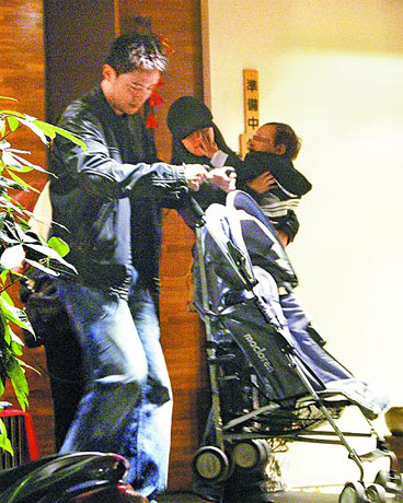 離開餐廳時(shí),徐懷鈺(右)被懷中小孩呼巴掌,仍是一臉慈愛,相親對(duì)象Evan在旁推著娃娃車。