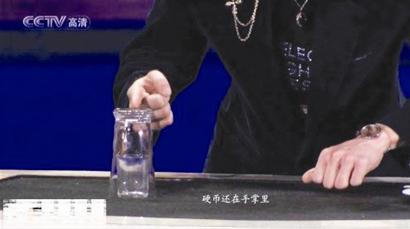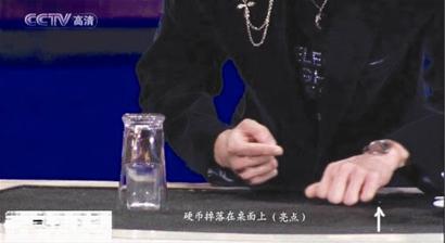 這個(gè)魔術(shù),實(shí)際上董卿是個(gè)托,因?yàn)槟g(shù)不涉及職業(yè)道德的問(wèn)題,只要給觀眾一個(gè)驚喜就可以了,董卿在兩個(gè)硬幣上簽名,當(dāng)然字體和樣式要相近,私下里簽好的早已經(jīng)給劉謙了。這時(shí),硬幣掉在了桌面上,細(xì)心的觀眾可以明顯的看到硬幣的反光。