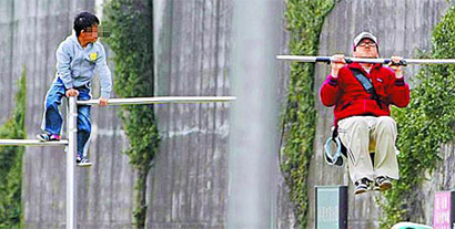 伊哈一家三口年初三到北海道團(tuán)聚,之后悄悄返臺,據(jù)說這次碰面是解決家務(wù)事,昨下午記者目擊哈林帶哈利到大佳河濱公園,好動的哈利一下車就直沖單杠,掛在杠子上蕩來蕩去,身手矯捷。哈林不時比手畫腳指導(dǎo)哈利如何使力,還童心未泯走到較高的單杠前大手一拉,吃力地拉了3下。隨后哈林抱起哈利教他爬樹,父子親近大自然玩得忘我。