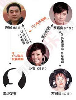 蘇巖和羅嘉良的結(jié)婚,用那個(gè)落后保守的詞來(lái)說(shuō),是兩個(gè)第三者的婚姻。蘇巖曾是中國(guó)電影第一錄音師陶經(jīng)的妻子,愛(ài)情源頭還是張藝謀的《活著》。蘇巖甘當(dāng)陶經(jīng)婚姻第三者,歷經(jīng)十多年終于結(jié)婚,而羅嘉良這次又介入了蘇巖的上一次婚姻。一直有猜測(cè)說(shuō)蘇巖是導(dǎo)致羅嘉良與發(fā)妻離婚的第三者,其實(shí)不是,反倒是羅嘉良讓蘇巖下決心離婚的,F(xiàn)在兩人還在北京買(mǎi)了豪宅,羅嘉良正式落戶內(nèi)地了。