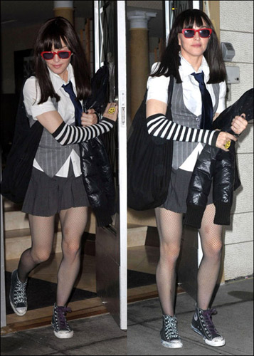 當天的麥當娜上身穿了白色的短袖校服,系著標志性的學生領帶配灰色馬甲,下身穿了灰色超短校服裙,配上了黑色的絲襪和學生的匡威板鞋,連頭發(fā)都變成了標準的清純齊劉海學生頭,手上更是帶了笑臉戒指,力求每個細節(jié)的完美。