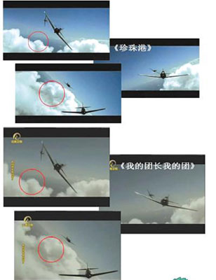 《團(tuán)長(zhǎng)》的一個(gè)飛機(jī)爆炸畫面,大量細(xì)節(jié)與《珍珠港》類似,只是爆炸地點(diǎn)從地面附近變換到云層中。