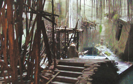 洞內(nèi)燈火通明,卻很陰冷潮濕,時(shí)不時(shí)聽到滴滴答答的水聲,十幾個(gè)工人正在忙碌著趕制道具。一位工人師傅告訴記者,“我們已經(jīng)在這里忙活兩個(gè)月了,洞內(nèi)的所有木頭橋、破房子、還有垂掛下來的藤條等等,全是人工打造的!