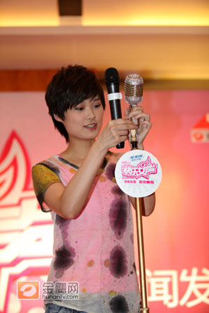 今日上午10點半,“2009快樂女聲”在北京舉行了發(fā)布會。05屆超女冠軍、擁有超高人氣的李宇春到場助陣,并成為了本次快女的形象代言人,F(xiàn)場她更是送上天價“金麥”為09快女加油。