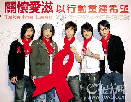 搖滾樂團五月天前天來到臺北101為2007世界艾滋病日點燈活動獻唱,并與臺灣知名棒球選手王建民一起點亮臺北101外墻上的紅絲帶,與世界同步關懷艾滋病患者,傳遞愛心!(晨曉)