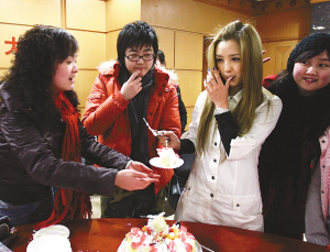 一位從事幼教工作的“盒飯”說很喜歡熱舞《BOYS》,閑暇還教小朋友們跳,何潔立刻調(diào)皮地說:“不會帶壞小孩子吧!睘槲繂柵枷,粉絲們還專門定制了印有何潔頭像的奶油蛋糕,可惜何潔怕破壞瘦身計劃,不敢品嘗。但為安慰粉絲,她還是親自切開蛋糕,分給大家大快朵頤。